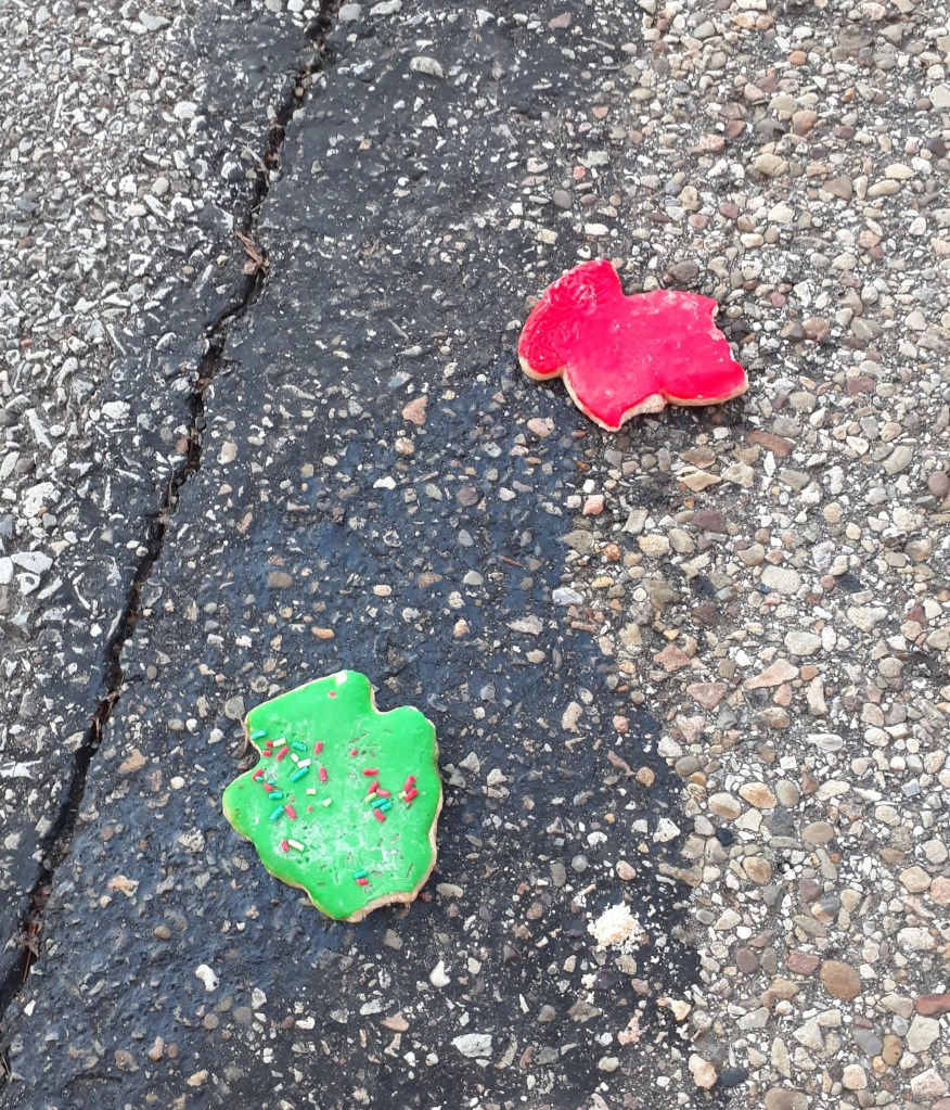 It is as if the artist wants us to note that the cookies, while festive looking, are in fact, imperfect. The green sugar cookie, decorated with haphazard sprinkles, or the colloquial term in Pittsburgh “Jimmies,” is in fact missing the top portion of the tree. This is a nod to the destructive nature surrounding the commercialization of the holidays.