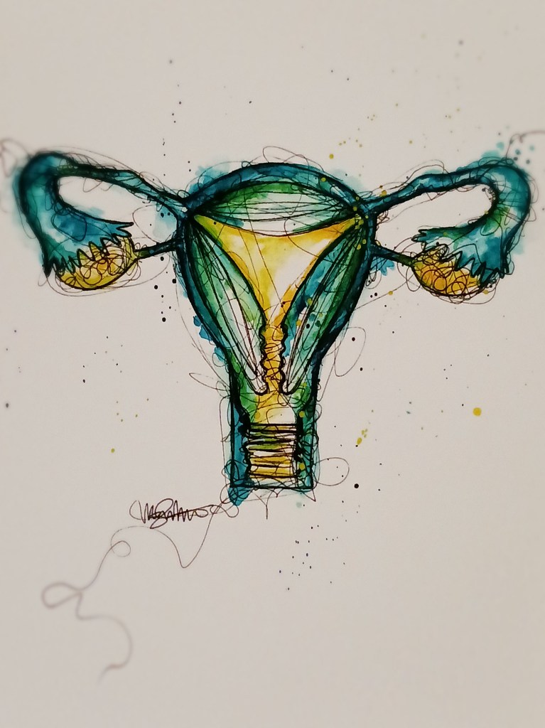 Next to the poetry collection for young readers by Naomi Shihab Nye, another book Clare sent me, one on how to use poetry to heal. On the first shelf, a religious charm my partner’s patient gave to him for us. “This necklace has helped many women get pregnant. Once you and your wife give birth, you can pass it on to another woman,” she said. On the bottom shelf, a drawing of a uterus by my friend Meghan. In the drawing, the uterus looks alive, electric, with blues and greens pushing off the page.